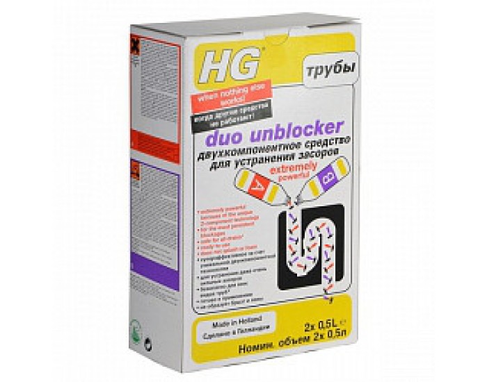 Засіб HG розроблений спеціально для усунення найсильніших засмічень, викликаних залишками їжі в кухонних трубах або волоссям, залишками зубної пасти в трубах у ванній.