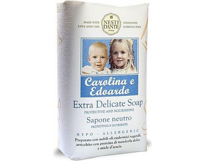 Деликатное детское мыло Nesti Dante "Каролина и Эдуардо" приготовлено с специальными маслами и обогащено медом, экстрактом календулы и протеинами миндаля. При изготовлении мыла использовалось оливковое и пальмовое масло высочайшего качества, мыло обогащено протеинами сладкого миндаля и меда, экстрактом календулы. Бережно и деликатно очищает кожу. Рецепт мыла был разработан владельцем фабрики и основателем компании "Nesti Dante" специально для своих внуков — Каролины и Эдуарда.