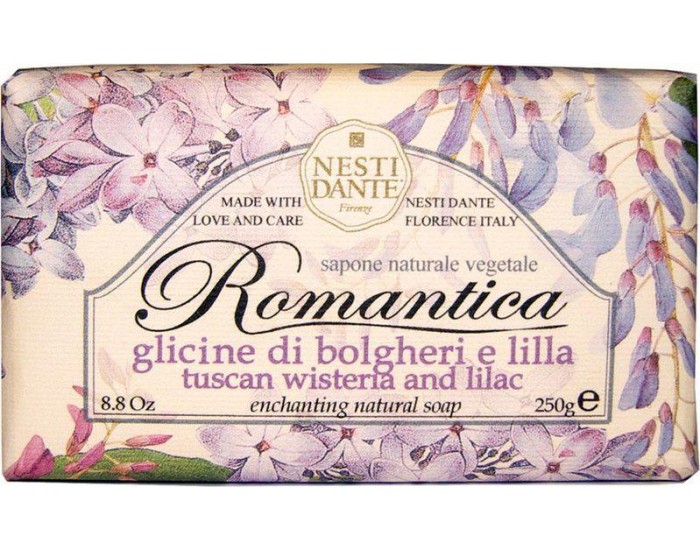 Натуральное мыло премиум-класса Nesti Dante "Romantica. Тосканская глициния и сирень" - два букета, бережно отобранные самые романтичные и эмоциональные ароматы, самые незабываемые моменты нашей жизни в магии цветов провинции Тоскана. Легкий и прозрачный аромат глицинии сочетается с легким и сладковатым ароматом сирени, нежный цветочный запах напоминает солнечный весенний день. Изысканная флорентийская бумага, в которую завернуто мыло, расписана акварелью, на каждом кусочке мыла выгравирована надпись "With Love And Care (С любовю и заботой)".