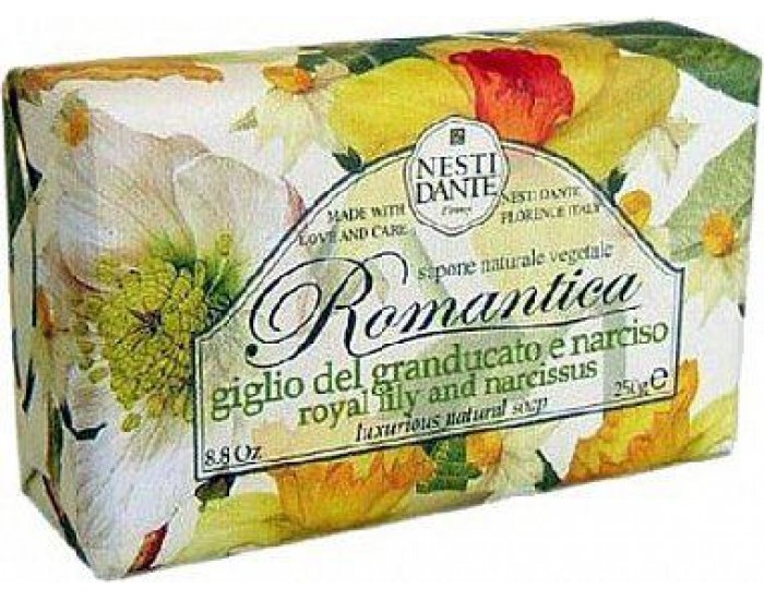 Натуральное мыло премиум-класса Nesti Dante "Romantica. Королевская лилия и нарцисс" - два букета, бережно отобранные самые романтичные и эмоциональные ароматы, самые незабываемые моменты нашей жизни в магии цветов провинции Тоскана. Лилия символ красоты и совершенства, обладает тонким и приятным ароматом, аромат нарцисса тонизирует и поднимает настроение.