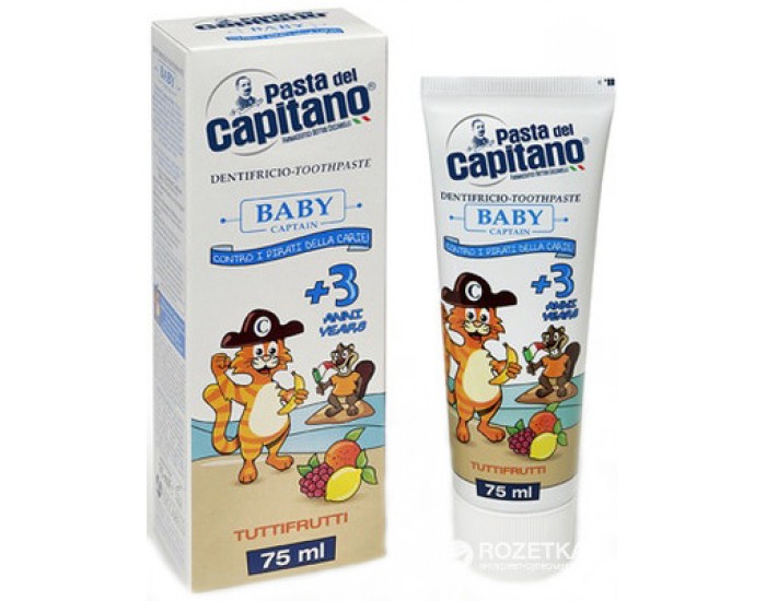 Нежная гелевая зубная паста Pasta del Capitano с ароматом Tuttifrutti, которая способствует поддержанию здоровых и сильных десен, а также полной защите молочных зубов благодаря своей формуле, обогащенной фтористыми солями и кальцием