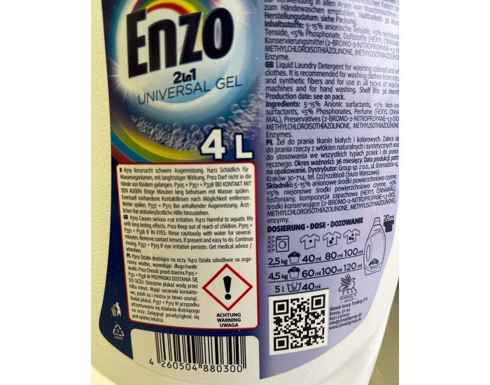 Универсальный гель для стирки Enzo предназначен для стирки цветных и белых вещей. Средство эффективно удаляет пятна и имеет приятный свежий аромат. Подходит для автоматической стирки в стиральной машине и для ручной стирки тоже. Рассчитан на 100 стирок. Произведенный в Германии.
