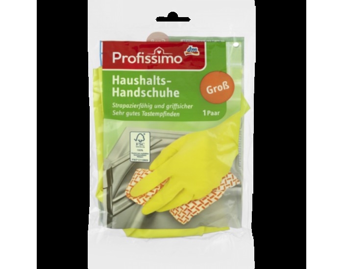Хозяйственные перчатки Profissimo изготовлены из приятного для кожи натурального латекса и улучшенного комфорта, хлопка. Структурированна поверхность перчаток для уборки, препятствует скольжению. Пониженное содержание аллергена в латексе, проходят проверку независимым исследовательским институтом.