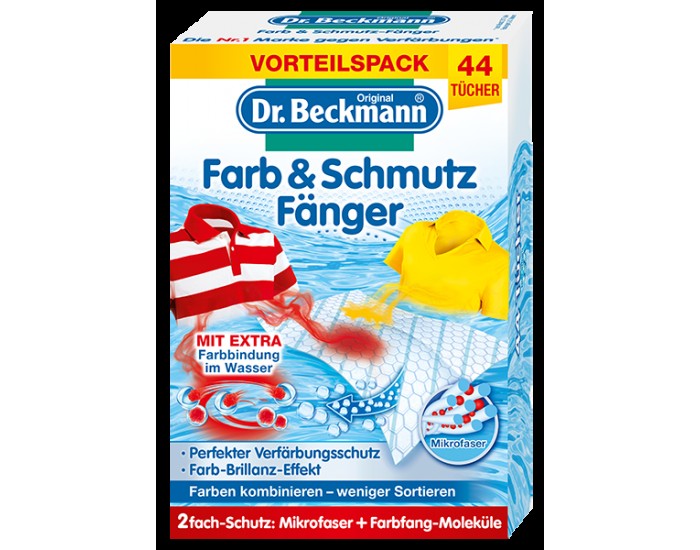 Салфетки-ловушки для цвета и грязи Dr.Beckmann – специальные салфетки, которые позволяют стирать одновременно белую и цветную одежду. Во время стирки цветная ткань может выделять красящие компоненты, которые с водой попадают на соседние вещи. Происходит окрашивание тканей в ненужные цвета. Салфетки-ловушки Dr.Beckmann обладают особыми впитывающими свойства и нейтрализуют красящие компоненты. В итоге цвет одежды остается неизменным. Благодаря микропорам салфетки абсорбируют краску, попавшую в воду. Подходят для стирки любой одежды при любом температурном режиме. Можно использовать как для машинной, так и для ручной стирки.