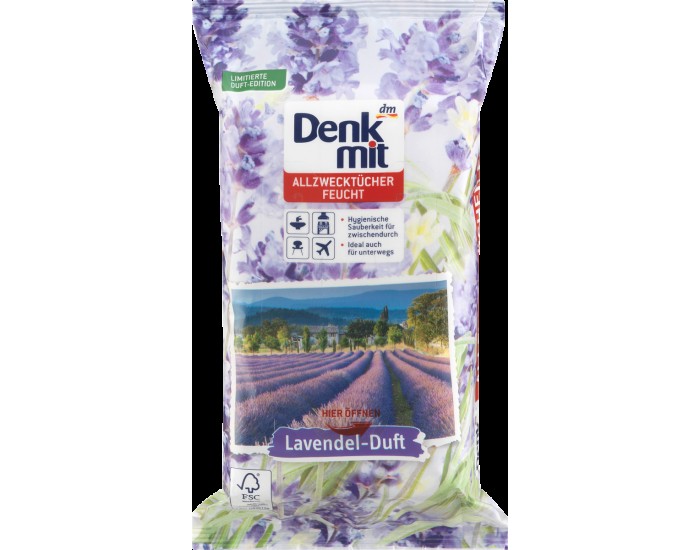 Влажные салфетки для уборки DENKMIT Feuchte Allzwecktücher Lavendel со свежим ароматом лаванды идеально подходят для быстрой и легкой очистки дома. Благодаря эффективной формуле очистки, моющиеся поверхности эффективно очищаются одной салфеткой - для гигиенической чистоты и свежести.Благодаря эффективной формуле моющиеся поверхности тщательно очищаются от пыли, грязи, налета.Совместимость с кожей одобрена дерматологами.