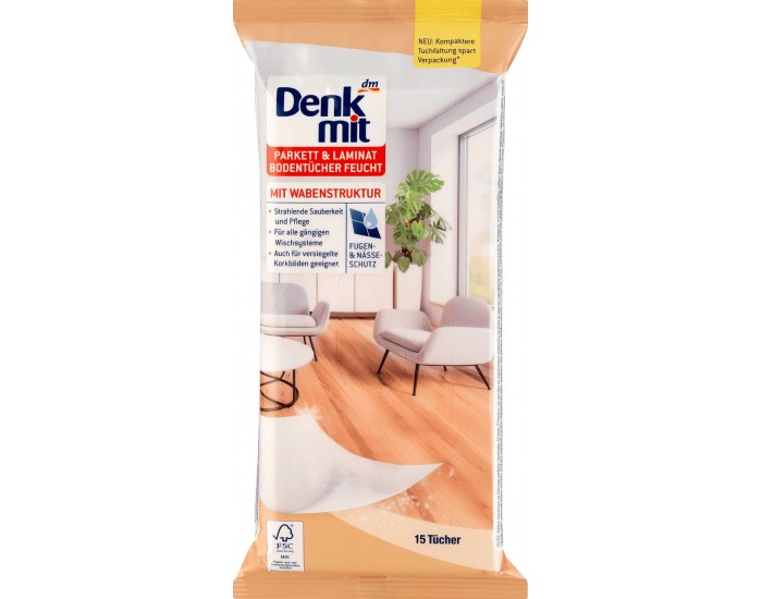 Влажные салфетки denkmit для паркета и ламината являются идеальным решением для быстрой и легкой чистки паркета и ламината. Специальная сотовая структура берет грязь отлично и обеспечивает чистоту даже на интенсивно используемом полу без разводов для сияющего блеска. Высококачественные компоненты защищают древесину от нежелательного набухания, вызванного влагой и влажностью и поддерживают поверхность чувствительного пола - игристая чистота по всей комнате. Дерматологически подтверждено.