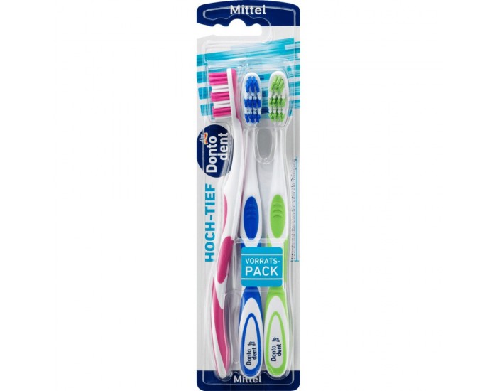 - Зубная щетка Dontodent средней жесткости с удлиненными щетинками предназначена для оптимальной чистки зубов в труднодоступных местах. Щетка имеет прорезиненную ручку, которая предотвращает скольжение в руке. А также очиститель языка на обратной стороне головки щетки. Упаковка содержит 3 щетки.