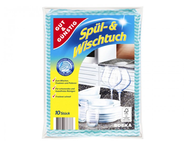 Салфетки Gut&Gunstig Spul Wischtuch универсальные для уборки в доме G&G предназначены для общего применения (для очищения любых поверхностей). Производятся изделия на вискозной основе. Салфетки идеально справляются с любого рода загрязнениями. Применять их можно для удаления пыли сухими, а также и влажными. Изделия прекрасно впитывают влагу и сочетаются с моющими средствами. Салфетки мягкие и приятные на ощупь, не раздражают кожу рук и, в то же время имеют высокий уровень прочности.