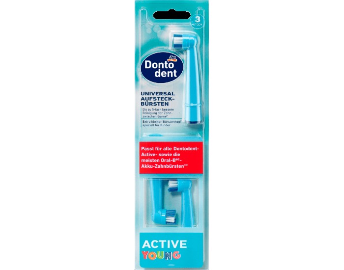 - Щетка-насадка Dontodend Universal Active Young имеет очень маленькую щеточную головку, особенно для детей, и обеспечивает в 5 раз лучшую очистку края десны.