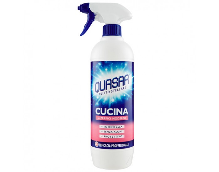 - Quasar Cucina очищає і дезінфікує сучасні поверхні будинку, не залишаючи слідів і розлучень. Його спеціальна і інноваційна формула допомагає захистити оброблені ділянки, зберігаючи їх з плином часу. Ідеально підходить для чищення та догляду за сучасними і дизайнерськими елементами меблів, такими як ламіновані або лаковані поверхні, склокераміка, індукційні плити, натуральні камені (мармур, граніт, кварцити), пластмаси.