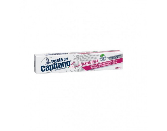 Называется эта зубная паста Pasta del Capitano Baking Soda, что с английского переводится как пищевая сода. Эта зубная паста и ее название — это своеобразная дань многовековым традициям ухода за зубами. Ведь пищевую соду, которая также содержится в этой пасте, еще с 18-го века активно использовали для отбеливания зубов, разводя ее с водой. Именно сода с давних пор помогала бережно и без вреда зубам убрать желтизну и коричневатый налет с зубов. Зубная паста Pasta del Capitano Baking Soda не содержит лаурил сульфат, формальдегиды, триклозан и парабены.